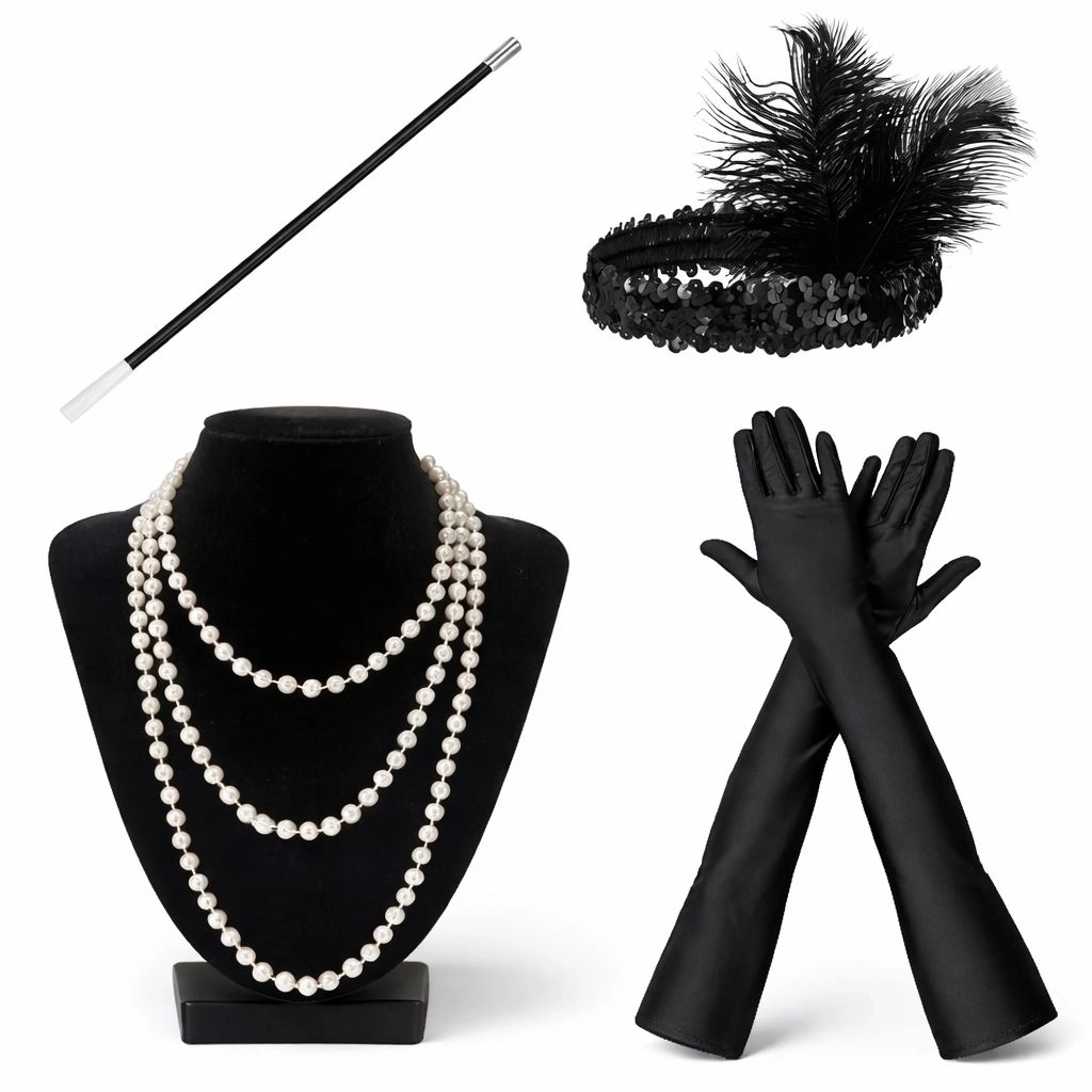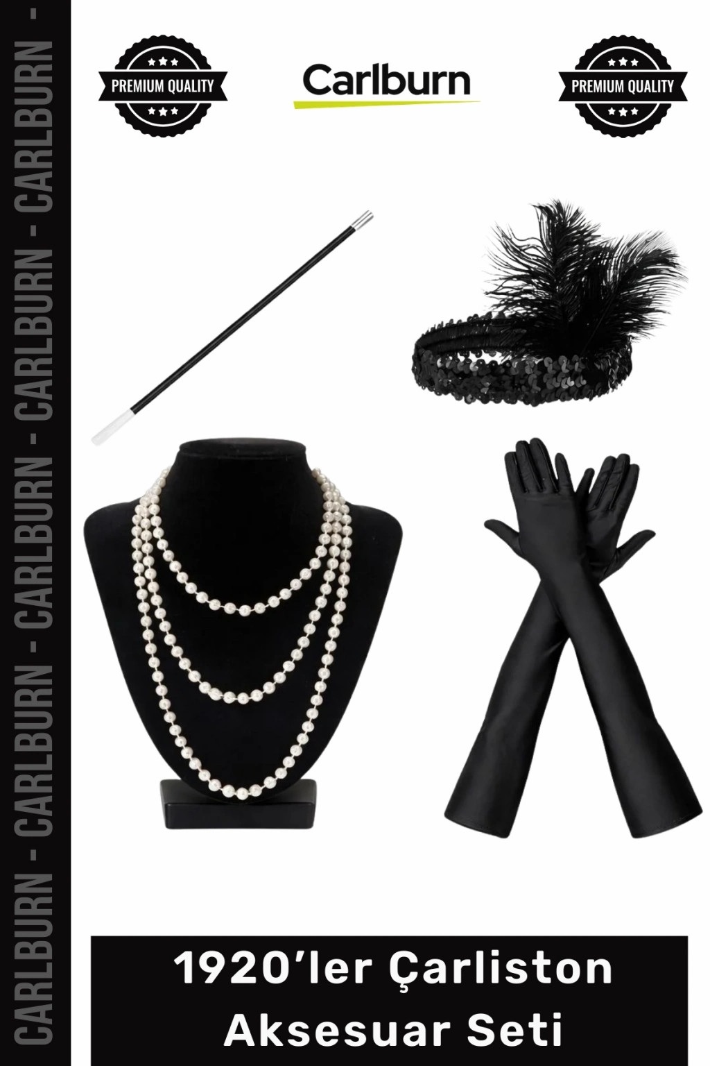 * **Göz Alıcı Saç Bandı:** Payet ve tüy detaylarıyla süslenmiş siyah saç bandı, dönemin ikonik "çarliston" stilini eksiksiz yansıtarak saç aksesuarlarınız arasında parlar.