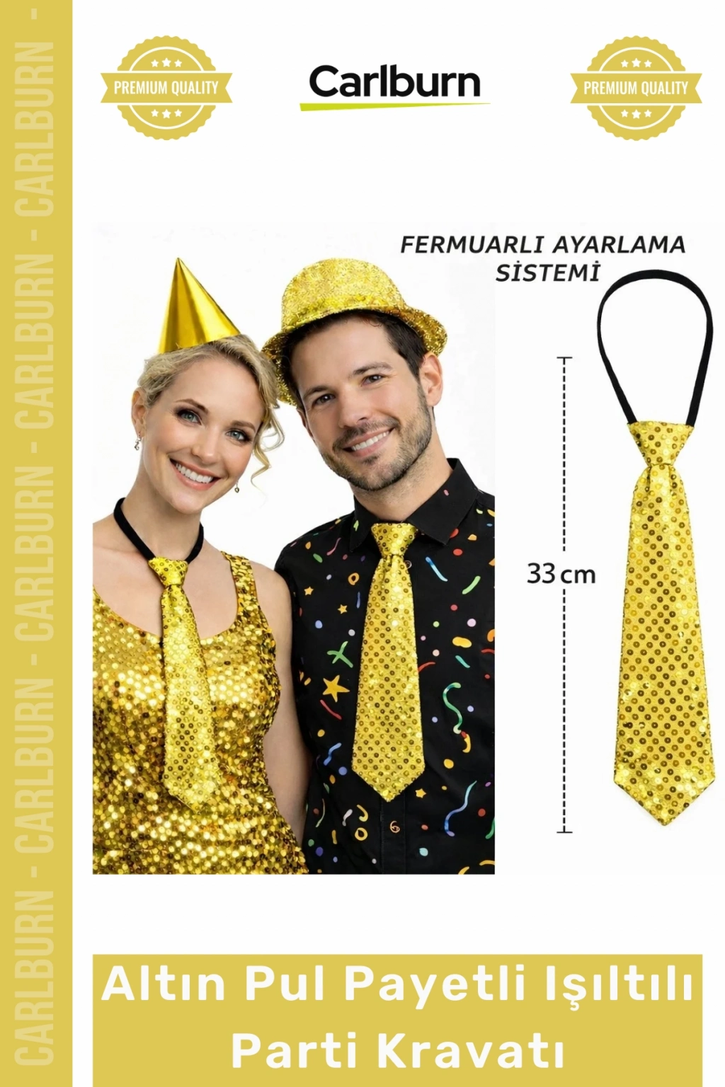 Her an parlamaya hazır olun! Özel Üretim Altın Renk Pul Payetli Işıltılı Parti Kravatı 33 cm, yoğun pul payet kaplamasıyla ışığı en güçlü şekilde yansıtan, bulunduğunuz her ortamda tüm dikkatleri üzerinize çekmenizi sağlayan göz alıcı bir aksesuardır. 33 cm'lik önceden şekillendirilmiş tasarımı sayesinde her zaman kusursuz ve hazır bir görünüm sunarak stilinizi anında yükseltir.