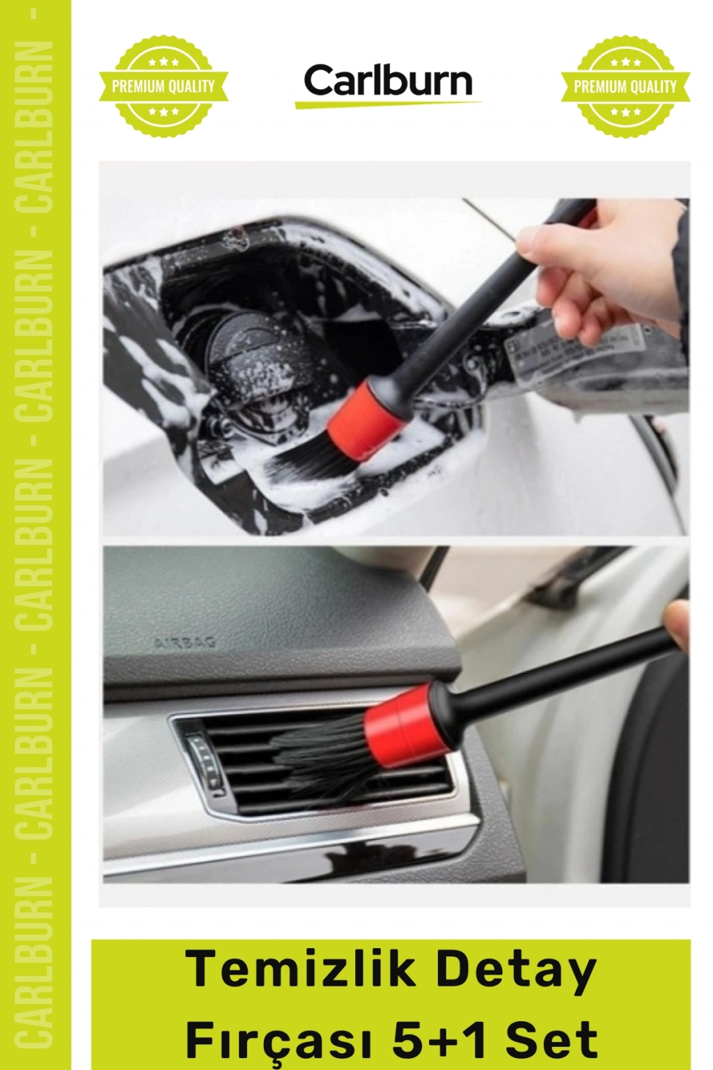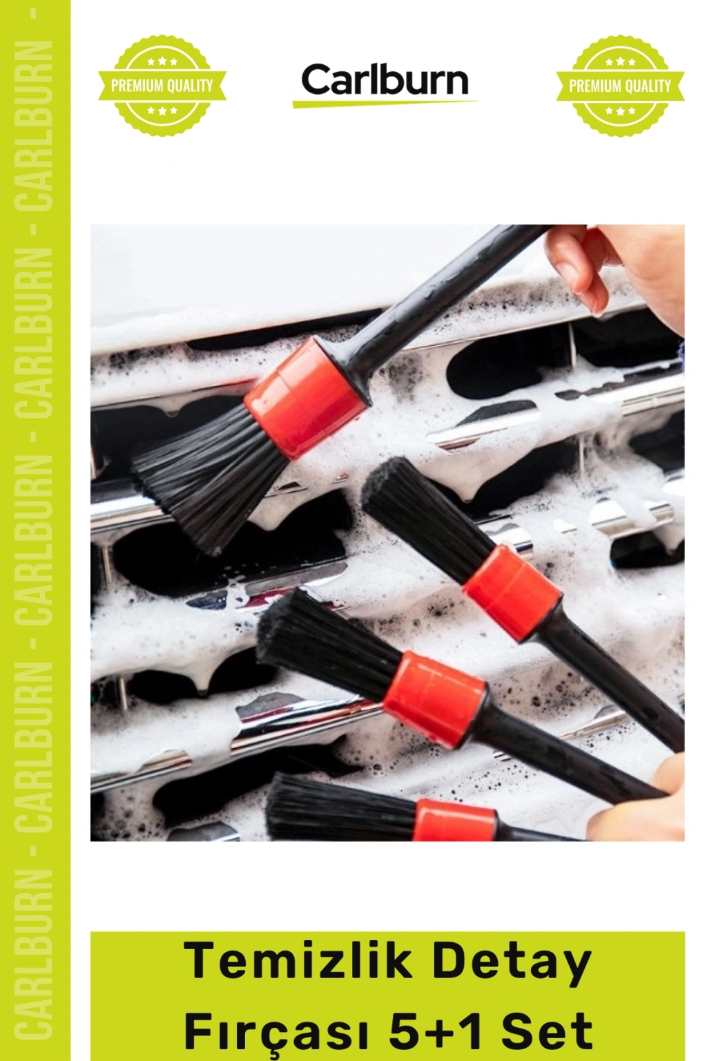 5 farklı boy ve kalınlıktaki fırçalar sayesinde bisikletinizi, motosikletinizi, otomobil ve kamyonunuzu, teknenizin lastik, jant, ızgara, motor, egzoz, tampon, çamurluk, kuşak ve daha birçok yerini detayı temizleyebileceksiniz.