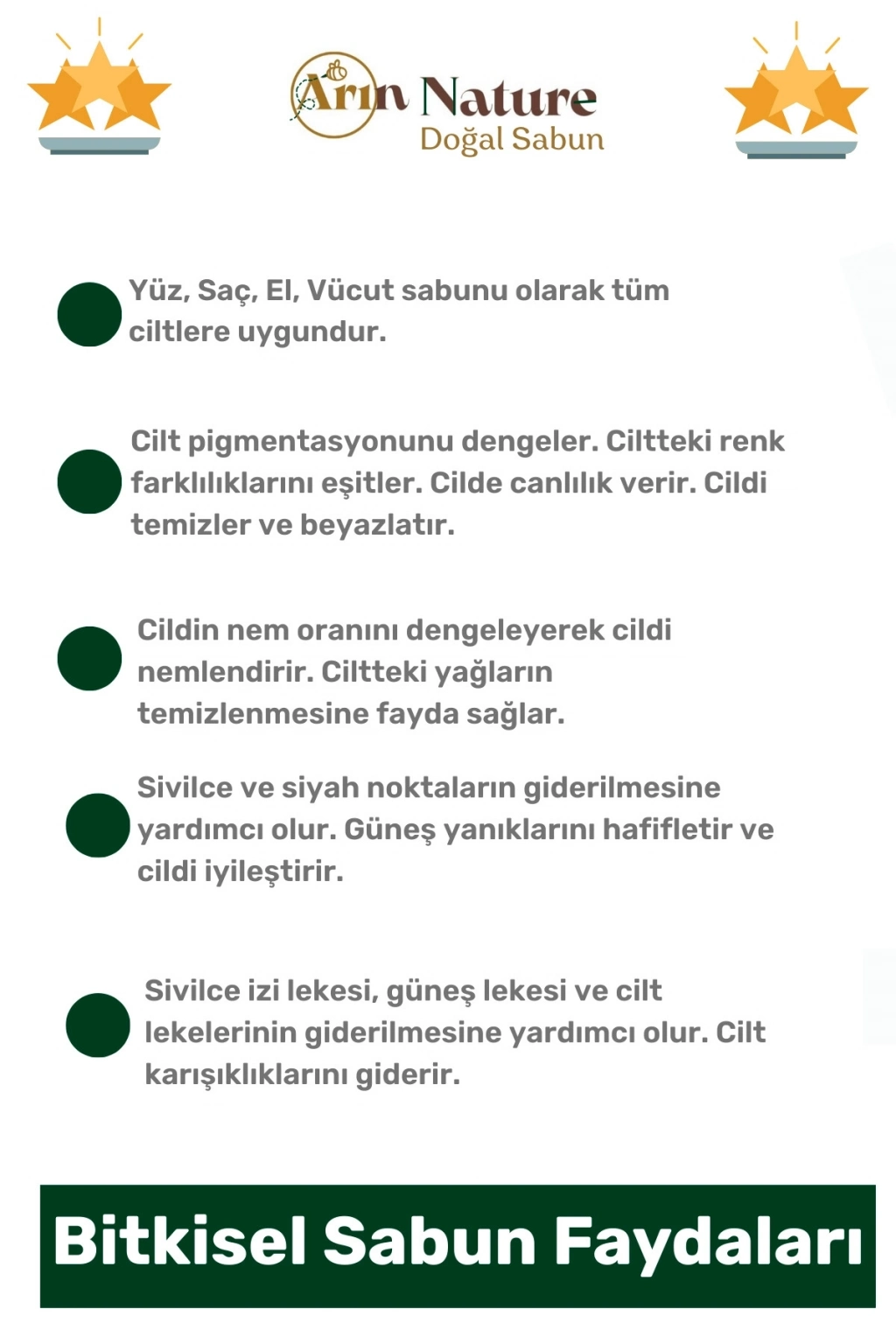 * **Çok Amaçlı Kullanım:** El, yüz, vücut ve saç temizliğiniz için güvenle kullanabileceğiniz bu bitkisel sabun, tüm ailenizin günlük bakım rutini için mükemmeldir. El yüz vücut saç sabunu olarak çok yönlü kullanım sunar.