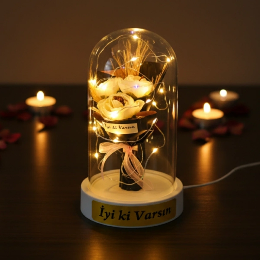 #Fanus Zarif Üç Güllü Romantik Hediye Gün Işığı Estetik Aydınlatma Gül Buketi Ledli Fanus