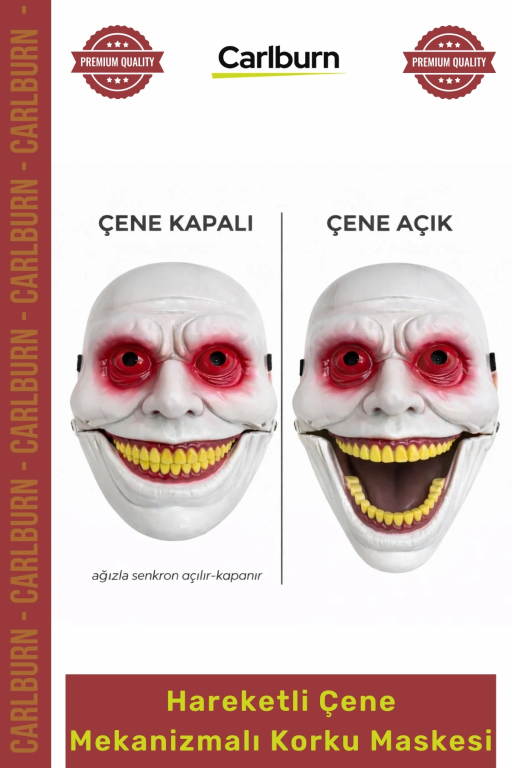 Özel Üretim Hareketli Çene Mekanizmalı Kırmızı Korku Maskesi, takan kişinin ağız hareketlerine senkronize olan devrim niteliğindeki çene mekanizmasıyla korku ve gerçekçiliği yeniden tanımlıyor. Bu eşsiz tasarım, sadece görsel bir şölen sunmakla kalmıyor, aynı zamanda her hareketinizde ürkütücü bir gerçekçi korku efekti yaratıyor. Detaylı diş tasarımı, belirgin yüz hatları ve dikkat çekici göz çevresi detaylarıyla bu maske, karanlık ortamlarda bile maksimum etkiyi garantiliyor.
