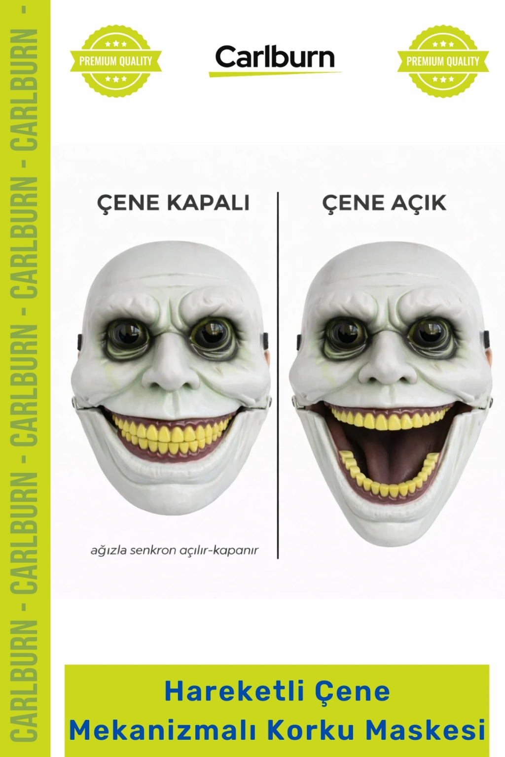 Özel Üretim Hareketli Çene Mekanizmalı Yeşil Korku Maskesi, takan kişinin ağız hareketlerine senkronize olan devrim niteliğindeki çene mekanizmasıyla korku ve gerçekçiliği yeniden tanımlıyor. Bu eşsiz tasarım, sadece görsel bir şölen sunmakla kalmıyor, aynı zamanda her hareketinizde ürkütücü bir gerçekçi korku efekti yaratıyor. Detaylı diş tasarımı, belirgin yüz hatları ve dikkat çekici göz çevresi detaylarıyla bu maske, karanlık ortamlarda bile maksimum etkiyi garantiliyor.