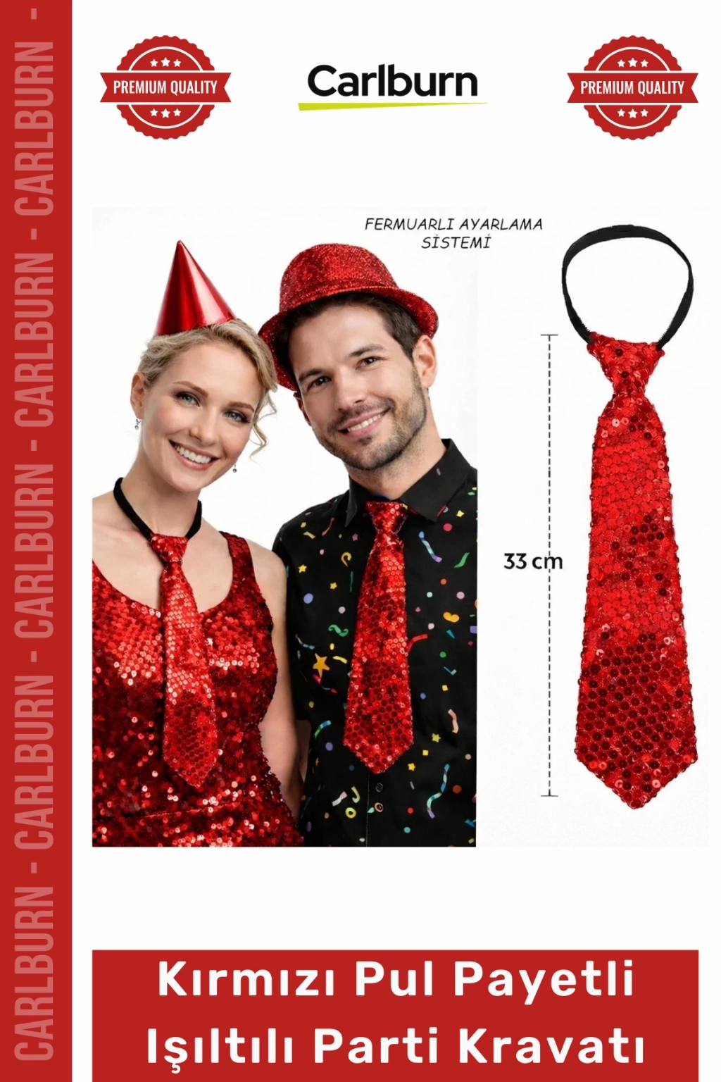 Her an parlamaya hazır olun! Özel Üretim Kırmızı Renk Pul Payetli Işıltılı Parti Kravatı 33 cm, yoğun pul payet kaplamasıyla ışığı en güçlü şekilde yansıtan, bulunduğunuz her ortamda tüm dikkatleri üzerinize çekmenizi sağlayan göz alıcı bir aksesuardır. 33 cm'lik önceden şekillendirilmiş tasarımı sayesinde her zaman kusursuz ve hazır bir görünüm sunarak stilinizi anında yükseltir.
