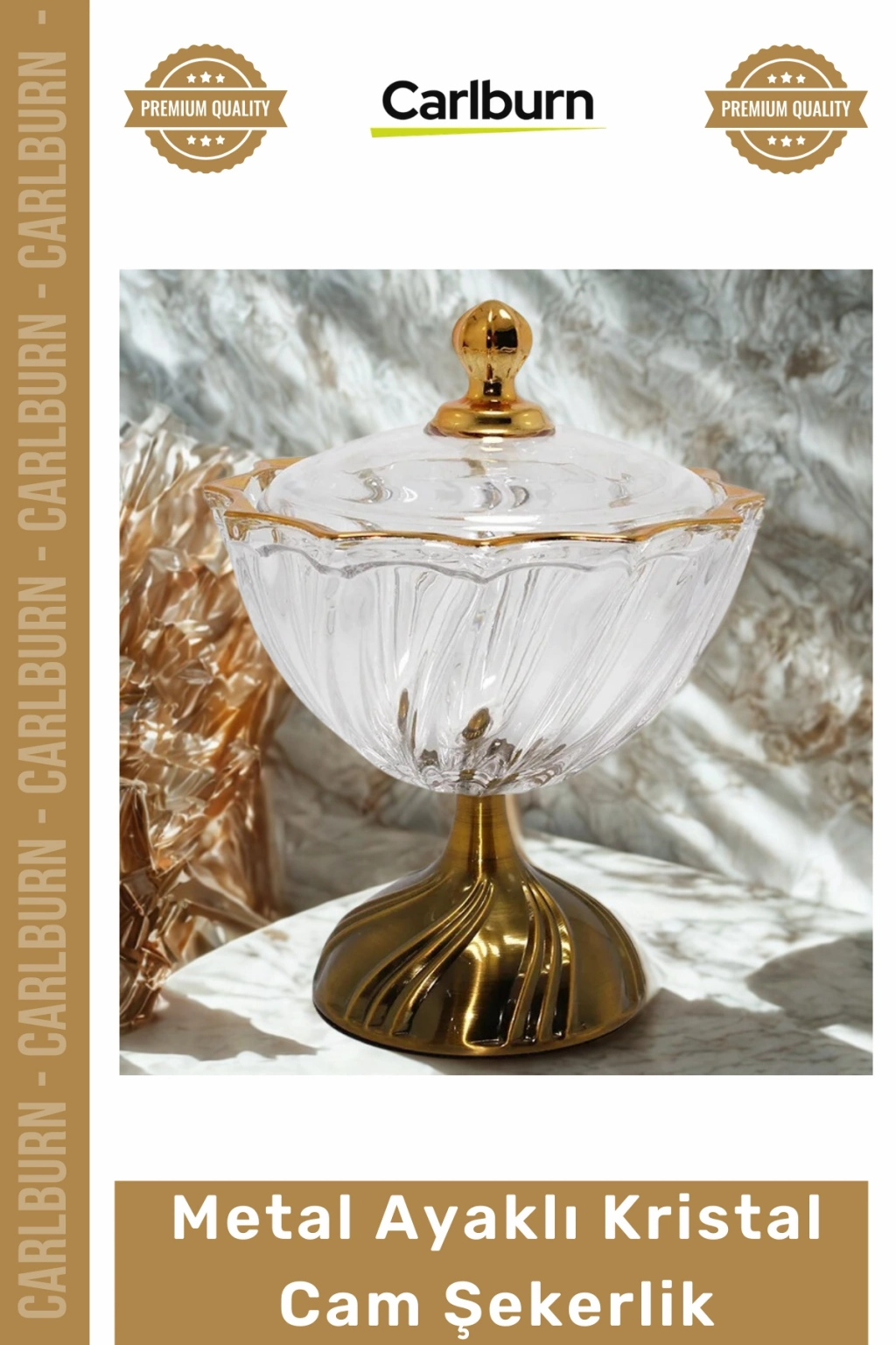 Özel Üretim Lüks Dekoratif Şık Lokumluk Metal Ayaklı Kristal Cam Şekerlik Gold Detaylı Sunumluk