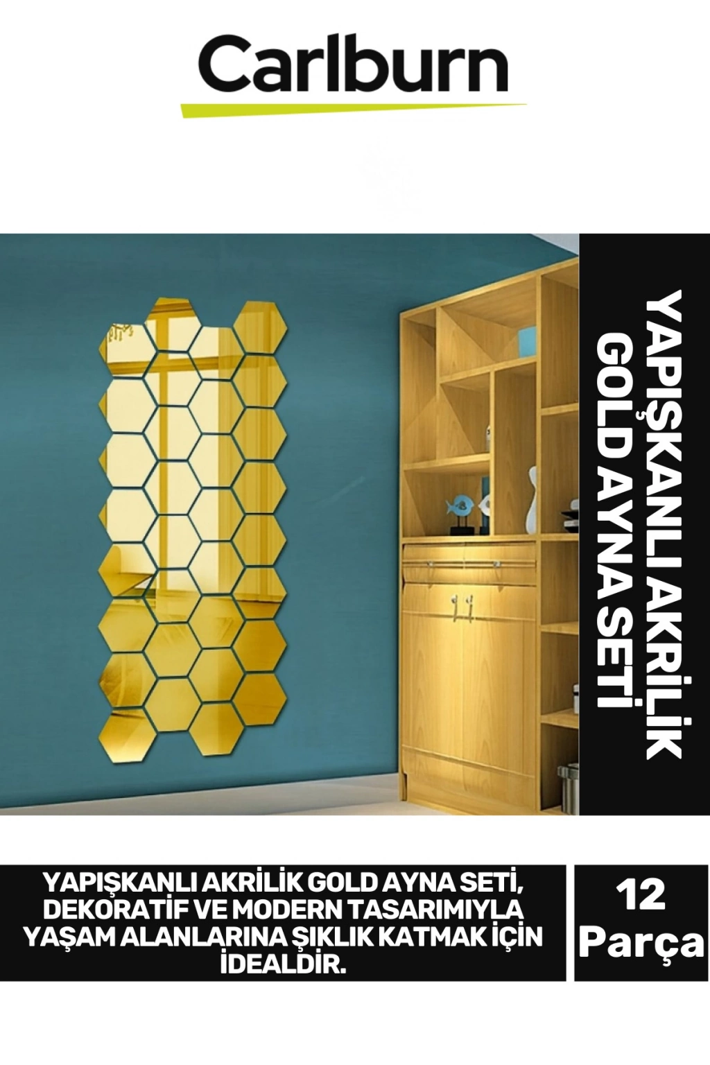 YAPIŞKANLI AKRİLİK GOLD AYNA SETİ 12 ADET Ürün Özellikleri Yapışkanlı akrilik gold ayna seti, dekoratif ve modern tasarımıyla yaşam alanlarına şıklık katmak için idealdir.; Akrilik malzemeden üretilmiş olup hafif ve dayanıklı yapısı sayesinde güvenle kullanılabilir.; Ürün, alt kısmında bulunan yapışkan yüzeyi ile kolayca monte edilir ve pürüzsüz yüzeylere rahatlıkla yapışır.; Yapıştırma işleminden sonra üzerindeki koruyucu film kaldırılarak parlak ayna görünümü elde edilir.; Altıgen tasarımı sayesinde farklı şekiller oluşturularak kişisel dekorasyon tarzınıza uygun kombinasyonlar yapılabilir.; Akrilik malzeme sayesinde kesici değildir, güvenli bir kullanım sağlar.; Ev, ofis, oturma odası, yatak odası ve dekoratif düzenlemeler için şık ve pratik bir çözümdür.; Paket İçeriği 12 adet yapışkanlı dekoratif akrilik gold ayna