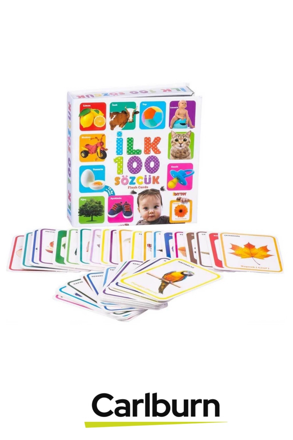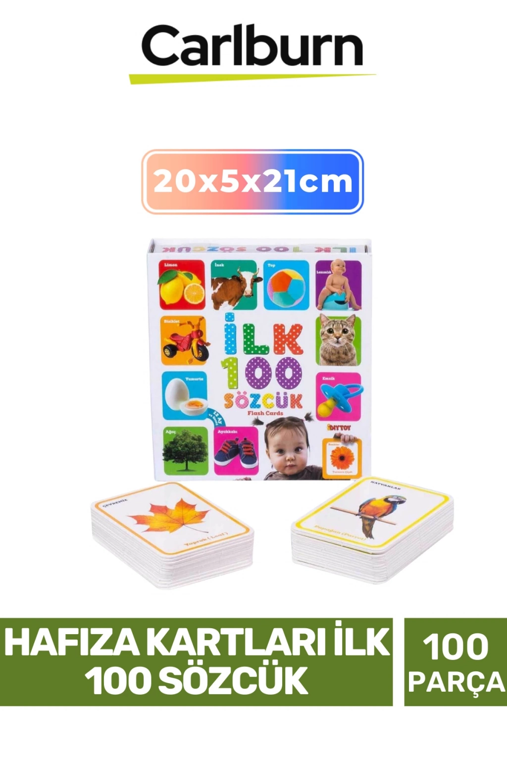 Hafıza Kartları İlk 100 Sözcük ile minikler hem öğrenecek hem de eğlenecekler! Sevgili Anne ve Babalar; bu eğlenceli flash cardlar çocukların dünyasında yer alan ilk 100 temel sözcüğü içerir.; Bu sözcükler ve resimler ile çocuklarınızın konuşmayı öğrenmeleri için gerekli ilk adımları atmalarına yardımcı olabilir, erken yaşta zeka gelişimlerine katkı sağlayabilirsiniz.; Çocuklara resimlerle örnek vererek öğrenimi ve akılda kalıcılığı kolaylaştırmaktadır.; Çocukların konuşmaya başladıkları dönemde ki ilk olarak tanıyacakları nesneleri barındıran ilk 100 sözcük kartları ile çocuklar günlük yaşamda ki kelimeleri eğlenerek öğrenecekler.; 12 ay ve üzeri çocuklar için; zeka gelişimlerini, konuşma becerilerini, merak uyandırma, görsel hafıza ve nesneleri tanımasına yardımcı olmaktadır.; Kart sayısı: 100 adet Ürün ölçüsü: 18 x 19 cm Kutu ölçüsü: 20 x 4,5 x 21 cm Ağırlık: 0,550 kg