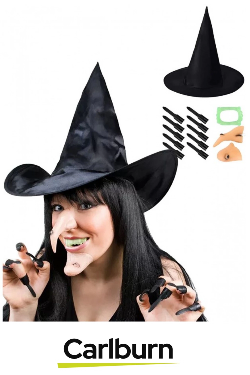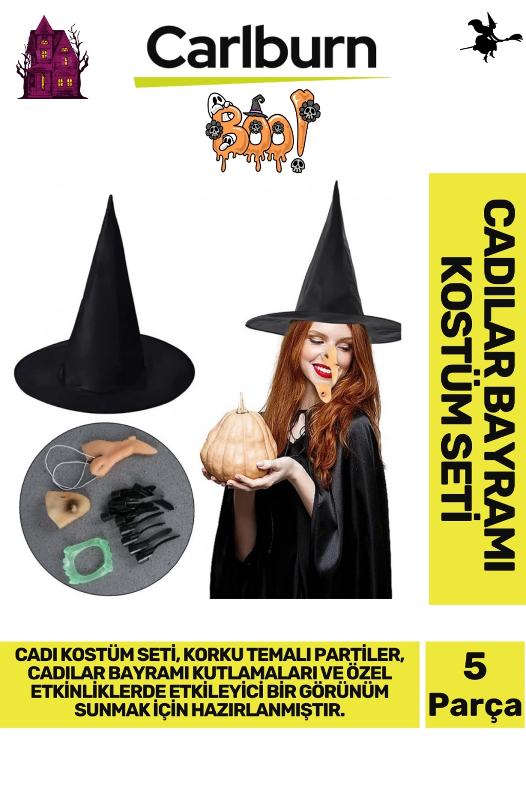 Özel Üretim Kaliteli Korku Temalı Uzun Sivri Şapkası Tırnakları Burnu Çenesi Dişi Cadı Kostüm Seti