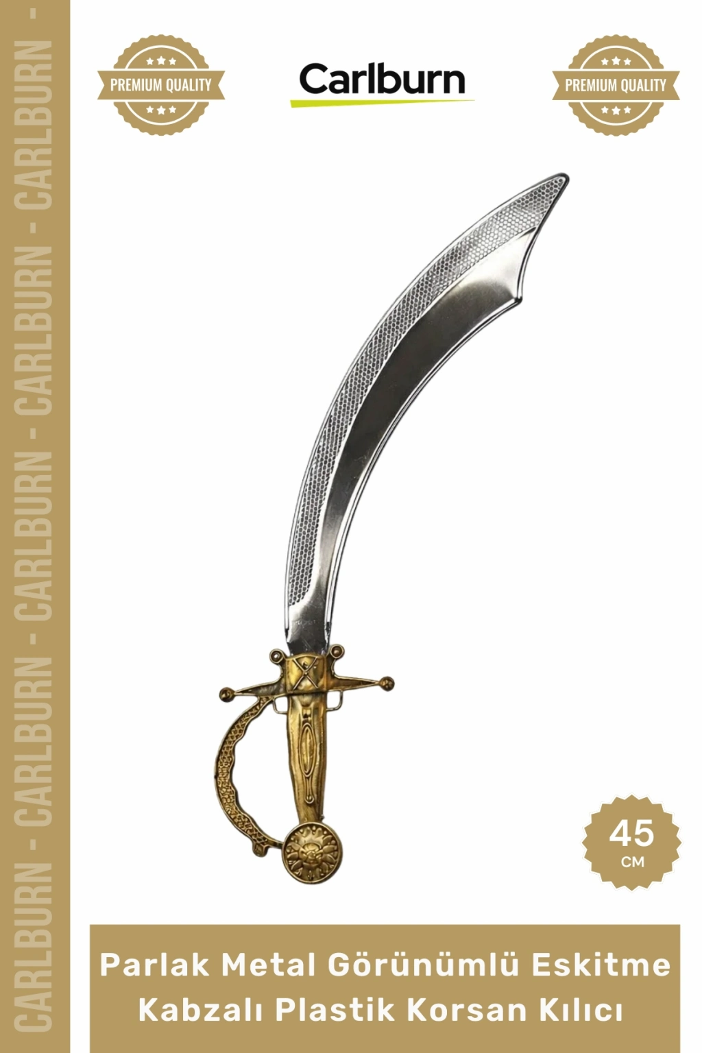 Parlak Metal Görünümlü Eskitme Kabzalı Plastik Korsan Kılıcı - 45 cm, benzersiz tasarımıyla dikkat çeken, temalı etkinlikler ve kostüm partileri için ideal bir aksesuardır. Bu özel üretim plastik korsan kılıcı, kavisli bıçak formu ve gerçekçi parlak metal görünümlü yüzeyi sayesinde otantik bir karakter sunar. Eskitme altın görünümlü kabzası ise ürüne tarihi bir dokunuş katarak, Doğu ve Osmanlı motiflerinden ilham alan detaylı işçiliğiyle her kostüme ihtişamlı bir hava katmaktadır. Hafif yapısı ve kolay taşınabilirliği ile hem çocukların hem de yetişkinlerin favorisi olacak bu kostüm aksesuarı kılıç, her türlü temalı organizasyonda güçlü bir tamamlayıcıdır.