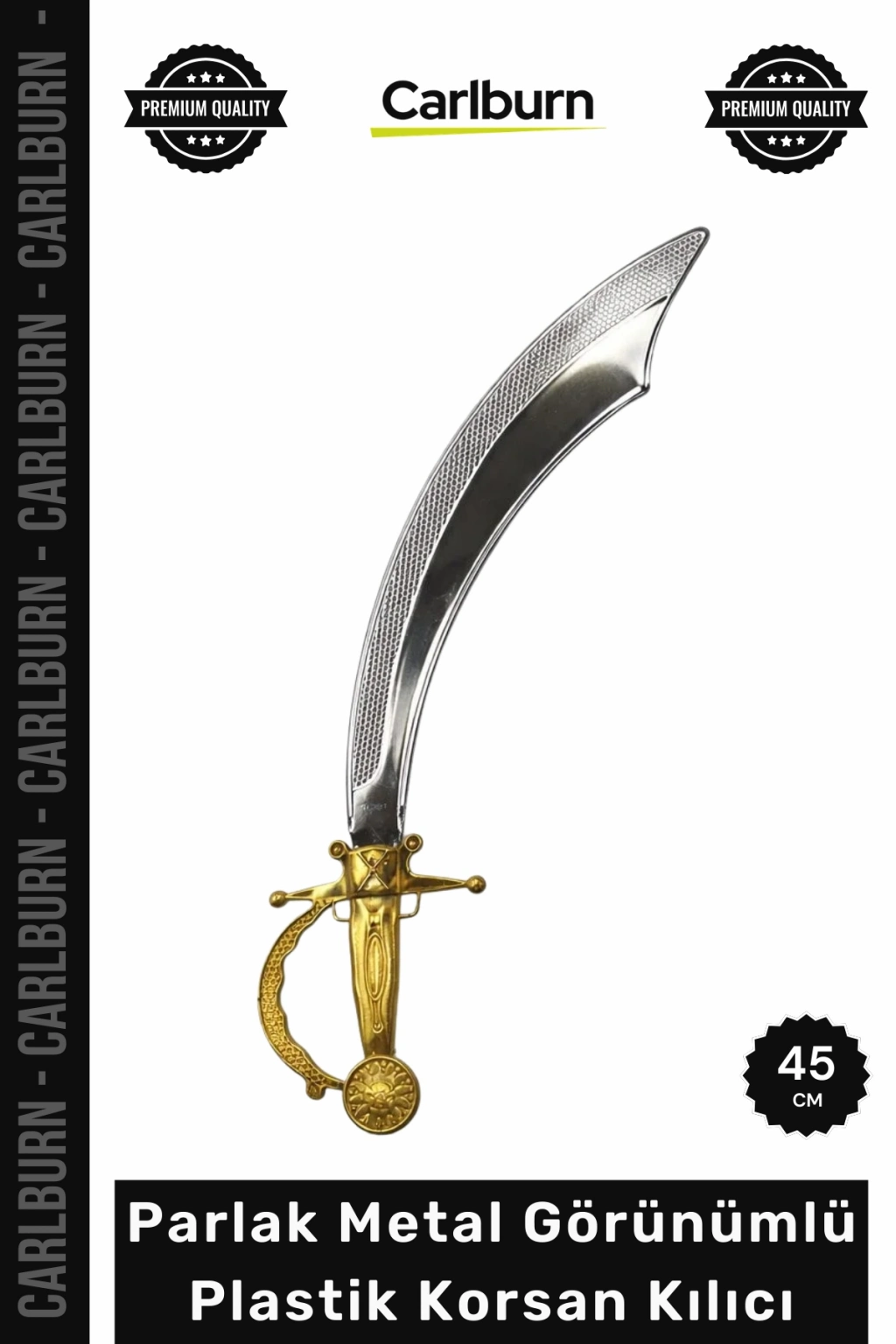 Bu eşsiz Parlak Metal Görünümlü Plastik Korsan Kılıcı - 45 cm, korsan temalı kostüm kombinlerinize anında dramatik bir etki katmak üzere özel olarak tasarlanmıştır. Klasik eğimli bıçak formu ve altın renkli kabza tasarımı ile dikkat çeken bu dekoratif aksesuar, parlak metal görünümlü yüzeyi sayesinde her ortamda etkileyici bir stil sergiler. Detaylı sap tasarımı, kılıcın görsel karakterini zenginleştirerek benzersiz bir görünüm sunar. Partilerin ve etkinliklerin gözdesi olmaya hazır olun.