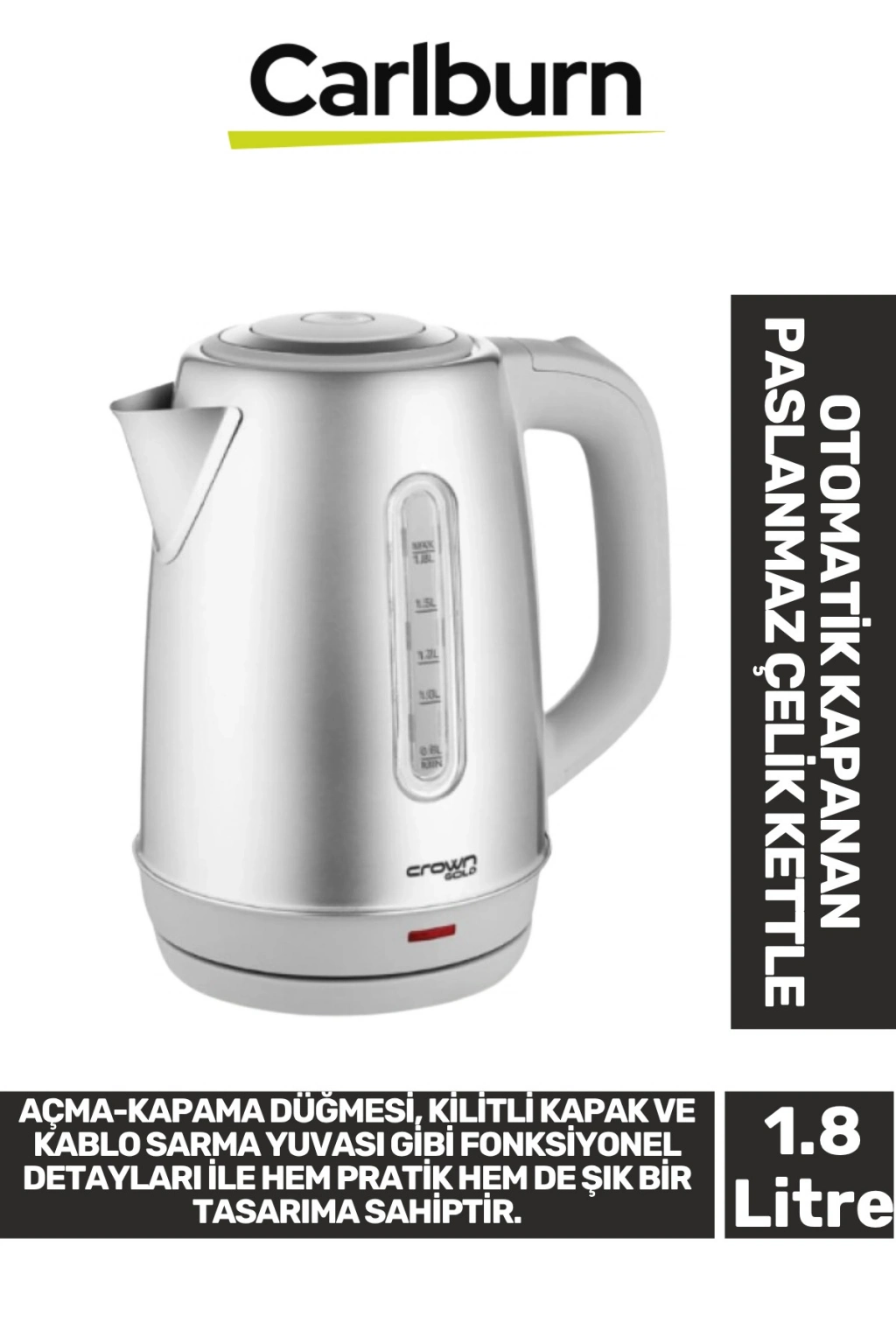 CRW-7211 paslanmaz çelik kettle, 1800W gücü ile suyu kısa sürede kaynatır.; 1.8 litre kapasitesi sayesinde kalabalık kullanımlar için idealdir.; Yüksek kaliteli 304 paslanmaz çelik gövdesi hem dayanıklılık hem de hijyen sunar.; Şeffaf su seviye göstergesi ile kullanım kolaylığı sağlayan ürün, otomatik kapanma sistemi ve susuz çalışmayı önleyen güvenlik özelliği ile güvenli kullanım imkanı verir.; 360 derece dönebilen tabanı, kablosuz kullanım kolaylığı sunar.; Açma-kapama düğmesi, kilitli kapak ve kablo sarma yuvası gibi fonksiyonel detayları ile hem pratik hem de şık bir tasarıma sahiptir.; Paket İçeriği 1 Adet CRW-7211 Paslanmaz Çelik Kettle
