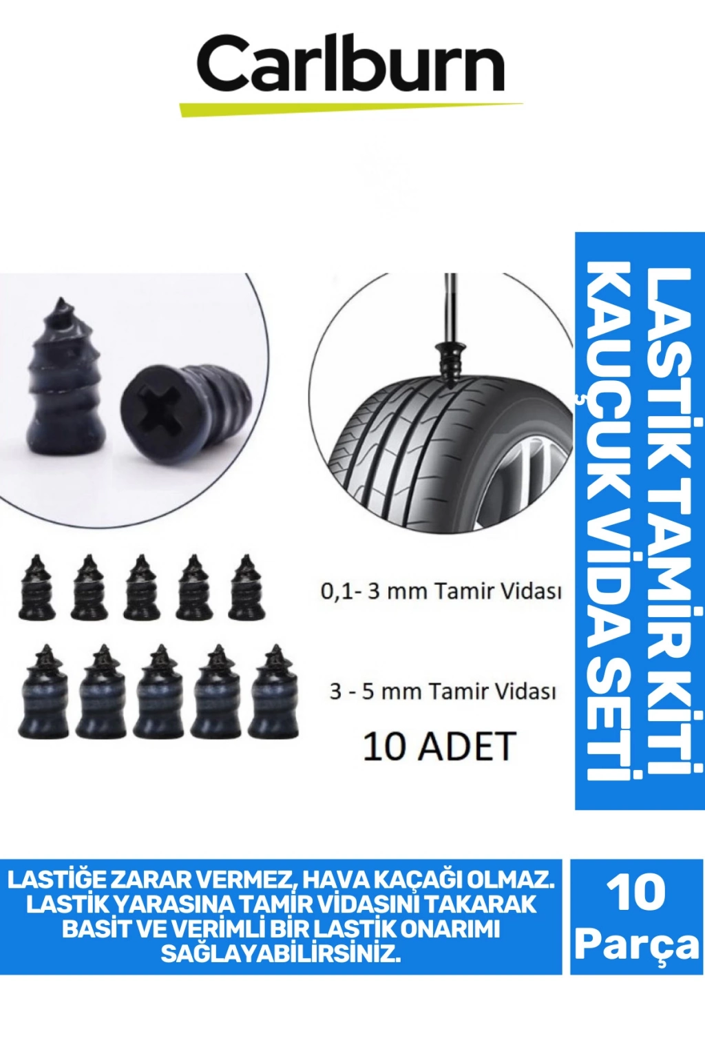 1. Lastiğe zarar vermez, hava kaçağı olmaz.; Lastik yarasına tamir vidasını takarak basit ve verimli bir lastik onarımı sağlayabilirsiniz.; 2. Lastikte yüksek bağlantı mukavemetine ve iyi sızdırmazlık performansına sahiptir,.; 3. Kullanımı kolay, bu lastik tamir vidası ile kendiniz lastik tamir edebilir, bir oto tamir dükkanı bulmaya gerek yoktur, ekonomik ve zaman tasarrufu sağlar.; 4. Yaygın olarak kullanılan alanları, profesyonel delinme tamir vidası olarak, otomobil, motosiklet, kamyon, otobüs ve tarım lastikleri için kullanılabilir.; Paket içeriği ve Uygulama kapsamı: 5 adet Küçük boyut: 0.1mm-3 mm için kullanılabilir 5 adet Büyük boy: 3 mm-5 mm için kullanılabilir Malzeme: kauçuk