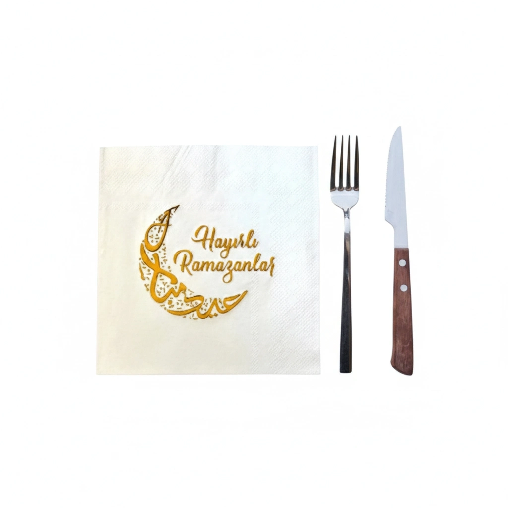 Ramazan Temalı Yaldız Baskılı Peçete ile iftar ve sahur sofralarınızı unutulmaz bir şölene dönüştürün. Bu özel üretim peçeteler, Ramazan ayının manevi atmosferini yansıtan altın rengi ay ve kandil figürleriyle bezenmiştir. Yaldız baskının sunduğu benzersiz şıklık, hem evdeki aile yemeklerinde hem de restoranların özel iftar davetlerinde estetik ve göz alıcı bir sunum garantiler. Misafirlerinize verdiğiniz değeri hissettiren bu ürün, zarafeti ve huzuru sofralarınıza taşıyor.