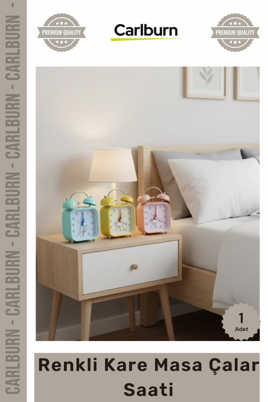 Renkli Kare Masa Çalar Saati, retro tasarımın nostaljik havasını modern ve canlı renk paletiyle birleştirerek mekanlarınıza enerji katar. Kompakt yapısı ve estetik duruşuyla sadece bir saat değil, aynı zamanda göz alıcı bir dekoratif objedir. 8 cm boyutundaki ideal tasarımı sayesinde komodin, çalışma masası veya raflarda fazla yer kaplamadan şık bir duruş sergiler.