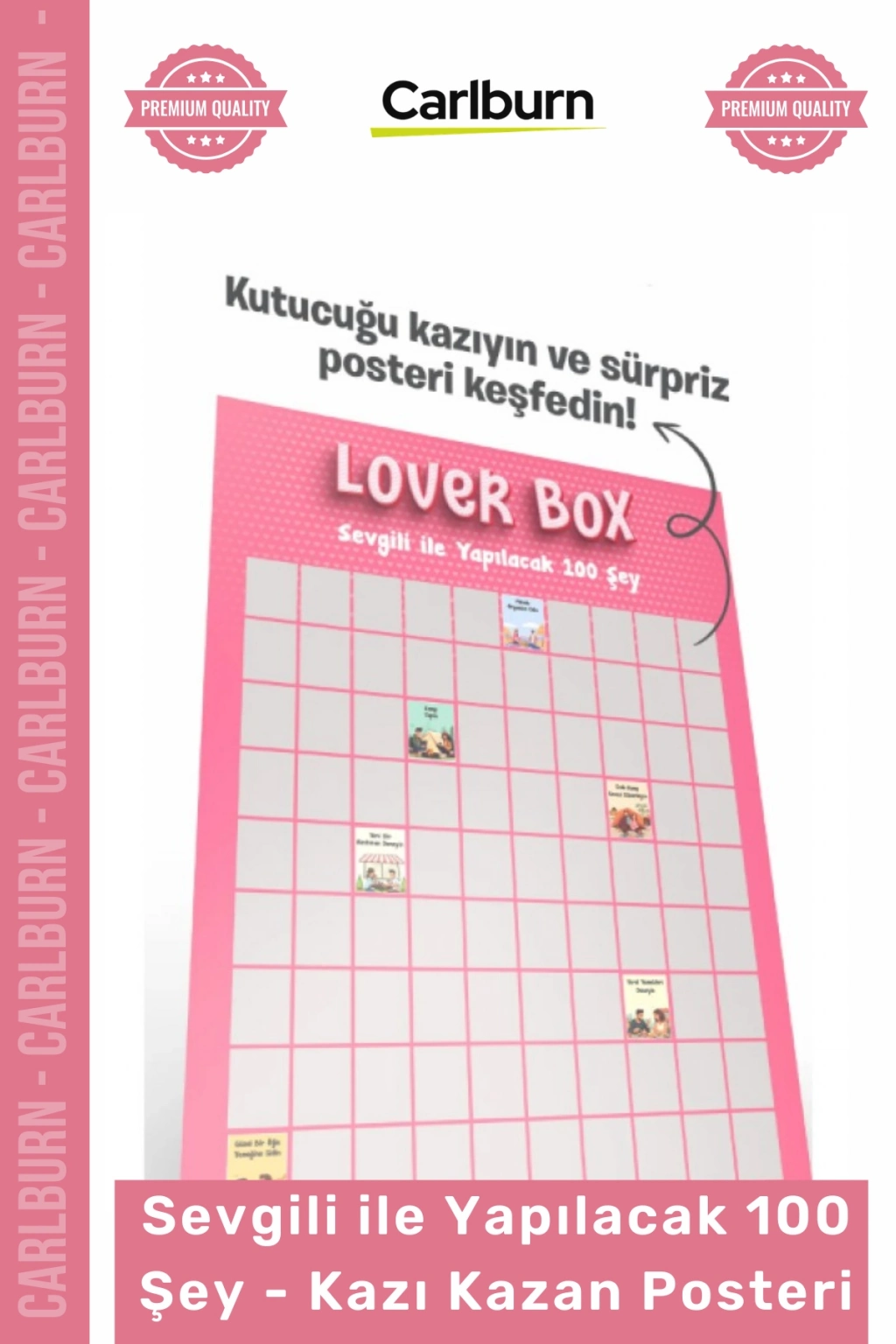 Sevgili ile Yapılacak 100 Şey Kazı Kazan Posteri, ilişkinizi daha heyecanlı ve eğlenceli hale getirmek için tasarlanmış özel bir anı rehberidir. Bu interaktif poster, partnerinizle birlikte keşfedebileceğiniz 100 farklı romantik aktiviteyi şık bir tasarım eşliğinde sunar. Kazıdıkça ortaya çıkan sürpriz illüstrasyonlar sayesinde ilişkinizin gelişimini görsel bir serüvene dönüştürebilir, tamamladığınız her görevi kalıcı bir anı olarak saklayabilirsiniz.